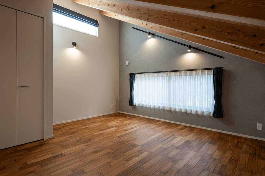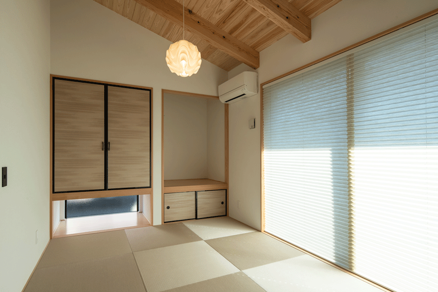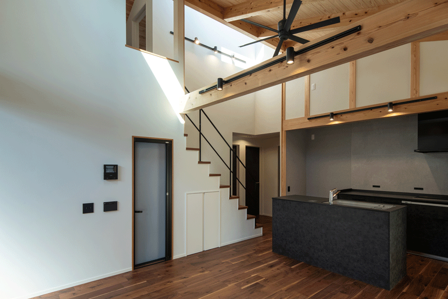 親から子へ世代を超えて代々住み続けるための住まいを建築。所有車が多いためビルトインガレージと敷地内の車庫を設ける。 外壁はジョリパッドによる塗り壁で自然の風合いが残る素材感に。LDKは阿蘇小国杉の美しい化粧材を使用し、勾配天井+トップライトで平屋のような空間が広々と存在する。ビルインガレージ上階に小屋裏の居室をプランし、ゆとりのあるプライベートスペースも確保。